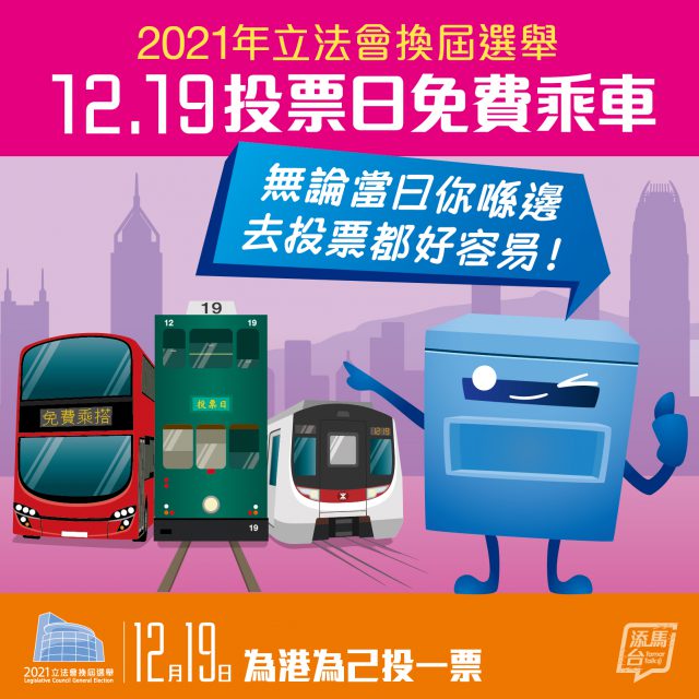 第七届立法会换届选举投票日(19日)在即,政府今日(16日)在社交专页「添马台」发文,指投票当日市民可免费搭港铁、巴士和电车,而投票时间是上午8时半至晚上10时半。 政府呼吁选民运用公民权利,选择民意代表,为市民服务,为香港筹谋,为港为己投一票。 免费乘车优惠范围: 港铁: √本地服务包括轻铁及港铁巴士 ×不包括机场快线 专营巴士: √九巴、新巴、城巴、龙运巴士及新大屿山巴士 ×不包括机场线、口岸线、观光巴士线、通宵巴士线、长途巴士新型服务线及若干屿南路线 电车: √所有路线