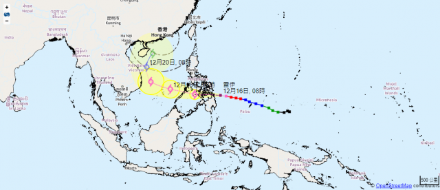 超强台风「雷伊」冬至(21日)送礼,杀入香港400公里范围,预测下周一(20日)起连落6天雨。天文台表示,香港入冬后甚少受热带气旋直接威胁,而由1961年至今只有4个热带气旋曾于12月份进入本港500公里范围,唯一一次要「挂波」更只有1974年的「艾玛」;「雷伊」随时成为历来第2次12月份挂波台风。 天文台表示,强台风「雷伊」现时已增强为超强台风。在上午10时,「雷伊」集结在马尼拉之东南约850公里,预料向西移动,时速约28公里,移向菲律宾南部。预测未来一两日横过菲律宾并进入南海南部,下周日(19日)转向偏北移动及逐渐减弱,但其后的路径及强度仍存在变数,暂时预计「雷伊」会在下周一以强烈热带风暴姿态进入香港以南800公里内,中心风力时速料会下降至105公里,并在周二冬至进一步减弱为热带风暴,靠近香港西南面约400公里,中心风力降至时速65公里。 天文台解释,香港入冬后一般甚少受热带气旋直接威胁,因南海北部水温较低,加上较凉和干燥的东北季候风亦不利热带气旋发展,会令它减弱甚至消散,而唯一一次本港12月份要「挂波」是1974年的热带气旋「艾玛」。艾玛当年12月1日逐渐靠近本港,天文台先后悬挂1号及3号风球,共维持超过27小时。12月2日天文台更录得177.3毫米雨量,创12月单日最高雨量纪录,至今仍未被打破。