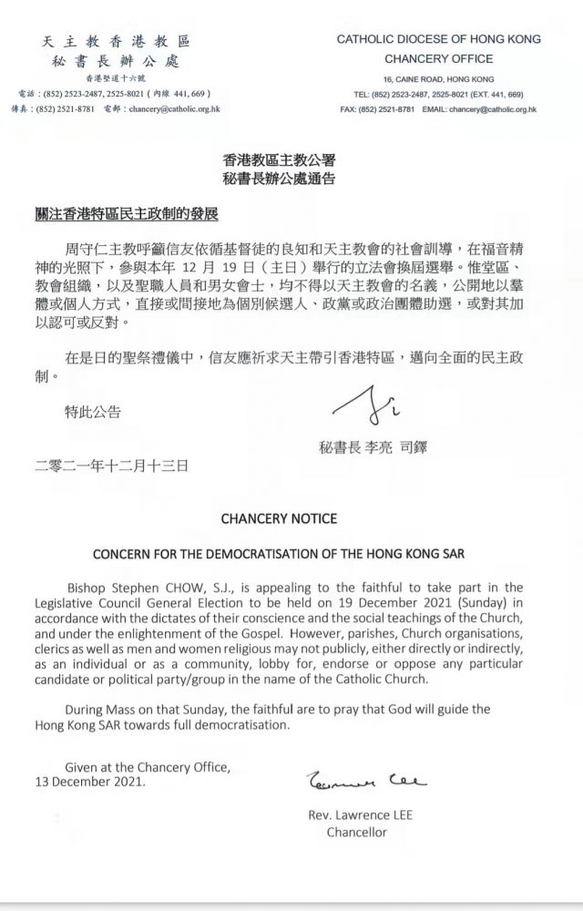 立法会选举将于12月19日进行,全部90个席位都出现竞争,本港宗教界多个团体呼吁市民踊跃投票。 其中,天主教香港教区指出,呼吁信友依循基督徒良知和天主教的社会训导,积极参与本次立法会换届选举。香港基督教协进会提到,希望合资格投票人士积极投票,尽公民责任,为港人求福祉。香港回教信托基金总会表示,投票是公民责任,冀所有合资格的在港穆斯林群体在投票日积极投票。 此外,啬色园指,一向支持港府完善选举制度,令香港重回「一国两制」轨道,落实「爱国者治港」,呼吁选民关心选举,踊跃投票。香港道教联合会提到,呼吁信众当日赴各区投票站投票,为香港开创更好明天。香港佛教联合会表示,寄望新一届立法会可照顾香港整体利益,解决社会矛盾,令民心安定,呼吁信众投下重要一票。