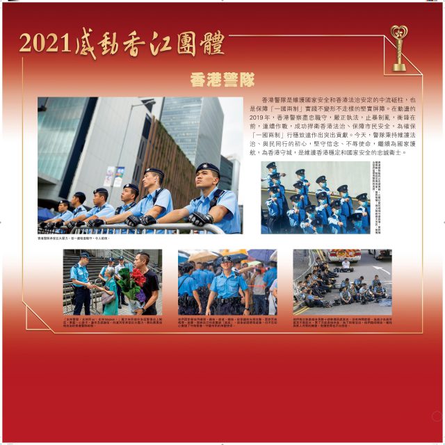 由香港大公文汇传媒集团主办的“2021 感动香江”评选颁奖典礼今日(9日)在香港隆重举行。本次活动共评选出四个“2021 感动香江团体”,八位“2021 感动香江人物”,以及向奋战在抗疫一线的香港医护工作者颁发了“2021 感动香江特别致敬”奖项。 四个“2021 感动香江团体”分别是捍卫香港法治、保障市民安全,为确保“一国两制”行稳致远作出突出贡献的香港警队;勇夺1金、2银、3铜,为祖国和香港特区赢得荣誉的东京2020奥运会中国香港代表团;用过人的意志取得了非凡成绩,取得2银3铜优异成绩的东京2020残疾人奥运会中国香港代表团;与时间赛跑,为香港港筑起战“疾”堡垒,为疫情防控构筑生命安全屏障的中国建筑工程(香港)有限公司全体施工团队。 此外,大会为奋战在抗疫一线的香港医护工作者领发了“2021感动香江特别致敬”奖,以此表示最崇高的敬意。 (来源:大公文汇)