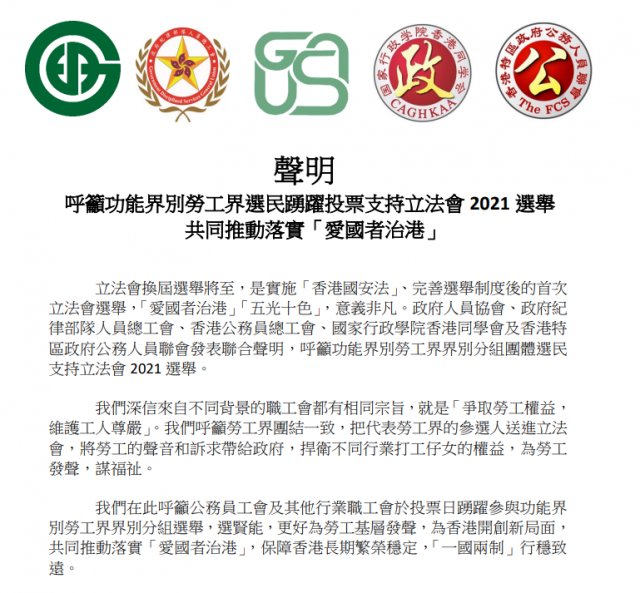 立法会换届选举将于12月19日举行,是实施香港国安法、完善选举制度后的首次立法会选举,“爱国者治港”呈现“五光十色”,意义非凡。政府人员协会、政府纪律部队人员总工会、香港公务员总工会、国家行政学院香港同学会及香港特区政府公务人员联会五个公务员团体今日(8日)发表联合声明,呼吁功能界别劳工界界别分组团体选民支持2021年立法会选举。 声明表示,深信来自不同背景的职工会都有相同宗旨,就是“争取劳工权益,维护工人尊严”,呼吁劳工界团结一致,把代表劳工界的参选人送进立法会,将劳工的声音和诉求带给政府,捍卫不同行业打工仔女的权益,为劳工发声,谋福祉。 五个团体呼吁公务员工会及其他行业职工会于12月19日投票日踊跃参与功能界别劳工界界别分组选举,选贤能,更好为劳工基层发声,为香港开创新局面,共同推动落实“爱国者治港”,保障香港长期繁荣稳定,“一国两制”行稳致远。