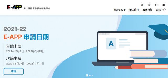 香港教育局明日(9日)推出新一轮“专上课程电子预先报名平台”(E-APP)网上报名服务,让应届香港中学文凭考试(文凭试)考生预先报读2022/23学年“大学联合招生办法”(联招)以外的全日制经本地评审副学位及学士学位课程,当中包括“指定专业/界别课程资助计划”下的副学位课程及“为修读香港自资学士学位课程学生提供的免入息审查资助计划”下大部分的合资格课程。新一轮的E-APP有约30所专上院校及其附属学院参与。 E-APP是免费电子报名平台,申请者透过E-APP系统填妥一份申请表,便可报读大部分联招以外的专上课程。有关专上院校会尽早处理申请,并可在文凭试成绩公布前,预先给予合资格的学生有条件取录。 E-APP的首轮申请期由明日起至2022年5月23日,次轮申请期则由2022年5月27日至7月11日。一般而言,院校会先处理首轮递交的申请。