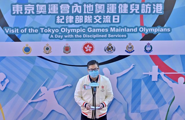 保安局局长邓炳强致开幕辞。(政府新闻处) 内地奥运健儿代表团昨日抵港后,今日(4日)除出席运动示范,当中5位健儿代表今日上午在消防及救护学院与纪律部队人员交流会面,分享他们的成功心得,并进行示范表演。保安局局长邓炳强及6个纪律部队首长代表特区政府热烈欢迎5位运动员莅临。 内地运动员(左起)苏炳添、刘诗颖、巩立姣、谌利军和李发彬。(政府新闻处) 5位运动员来自国家举重队及田径队,分别为李发彬(男子举重61公斤级)、谌利军(男子举重67公斤级)、巩立姣(女子铅球)、刘诗颖(女子标枪)和苏炳添(男子100米)。 内地田径运动员苏炳添(左一)向纪律部队代表示范田径的技巧。(政府新闻处) 是次交流活动共有约500名参与者。除了纪律部队人员外,还包括各部队青少年制服团队的队员及其管理委员会委员。出席人士除了可一睹5位内地奥运健儿一展身手的风采外,还能聆听他们分享成功心得。 内地田径运动员刘诗颖示范标枪的技巧。(政府新闻处) 邓炳强致开幕辞时特别感谢国家体育总局和香港中联办,安排内地奥运健儿在紧密的行程中,与纪律部队交流见面,充分体现了中央政府对香港纪律部队的支持和肯定。他寄语各纪律部队同事以及青少年制服团队队员,学习内地奥运健儿的坚毅和努力,积极装备自己,为国家和香港作出更多贡献。 奥运健儿和纪律部队人员拉动车辆为香港特殊奥运会筹款。(政府新闻处) 活动亦设有为香港特殊奥运会筹款的拉车环节。邓炳强感谢制服团队的管理委员会委员捐出善款,为这次交流活动锦上添花。 巩立姣(左一)向纪律部队代表和青少年制服团队队员分享推铅球的技巧。(政府新闻处) 李发彬(右)向纪律部队代表示范举重的技巧。(政府新闻处) 谌利军(左)向纪律部队代表示范举重的技巧。(政府新闻处) 纪律部队首长率领奥运健儿和纪律部队人员分别拉动车辆,政府飞行服务队人员则以车拉动直升机。(政府新闻处) 邓炳强(右)向香港特奥会主席林颢伊致送拉车环节筹得善款的支票。(政府新闻处)
