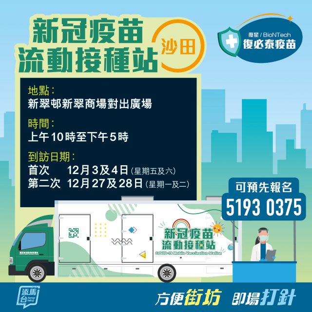 政府今日(2日)在社交专页「添马台」发文,指新冠疫苗流动接种车明日(3日) 正式出动,第一站将到沙田新翠村,提供复必泰疫苗接种。无论要打第一、第二或第三针都可以,呼吁街坊们尤其是长者和长期病患者快把握机会。 帖文指出,市民可即场打针或致电5193 0375预先报名以节省轮候时间。接种车随后会到观塘、葵青和屯门。 日期:12月3日及4日 (第二次到访日期为12月27日及28日) 时间:上午10时至下午5时 地点:沙田新翠村新翠商场对出广场