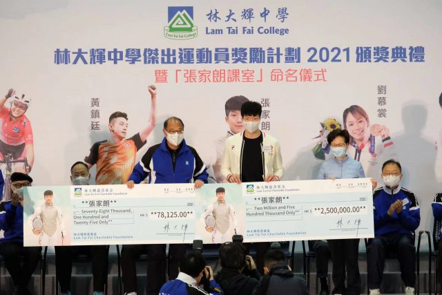 林大辉中学今日举行“杰出运动员奖励计画”颁奖典礼,并举行“张家朗课室”揭幕仪式。一众校友港队代表获颁发奖金,其中为港摘下东京奥运男子花剑金牌,有“剑神”之称的张家朗,获颁发约250万元奖金。 张家朗与另一剑击代表杨子加、单车代表李思颖、划艇代表洪泳甄等港队运动员,今早回到位于沙田的母校出席典礼。行政长官林郑月娥、民政事务局局长徐英伟及校监林大辉等人担任典礼的嘉宾。 林郑月娥致辞时表示,教育局近日推出试行版的《价值观教育课程架构》,认为当中很多价值观都在体育中体现,例如坚毅、尊重他人、国民身份认同、承担精神、勤劳等,而精英运动员站上颁奖台,国歌奏起、区旗升起之时,国民身份认同应该是油然而生。她认为,体育发展不单是争夺奖牌,更有深层的意义,希望体育界继续努力。 另外,林大辉中学将两个课室,分别以张家朗及另一旧生、东京奥运空手道女子个人形铜牌得主刘慕裳命名。 林大辉中学过去17个学年培育了不少香港体坛精英,除在东京奥运摘牌的奥运花剑金牌张家朗和空手道铜牌刘慕裳外,还有世界单车冠军郭灏霆、“乒乓一哥”黄镇廷、亚运奖牌得主欧倩莹、崔浩然、杨子加、廖文希及方凯申等人。