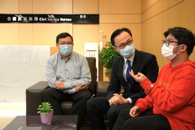 公务员事务局局长聂德权今日(30日)与两名参加政府实习计划的职业训练局展亮技能发展中心(展亮)学生见面,了解他们在实习期间的体验和得着,并鼓励他们继续努力学习,装备自己。 聂德权表示,公务员事务局自2016年起推出实习计划,让有特殊教育需要的学生有机会在政府实习,汲取实际工作经验,同时让政府同事有更多机会加深了解他们的潜能。由计划推出至今,已有共490名学生参与计划。 是次共有32名展亮学生参加实习计划,他们于10月获派到23个决策局和部门,进行为期约八星期的实习。当中在公务员事务局实习的赖文杰和陈浩霆,均认为实习计划提供了宝贵机会,让他们学习工作技能,令他们成长不少。 在物料供应事务室实习的赖文杰说,是次实习是他第一次的工作体验。他指能够顺利遵从指示并完成工作,为他带来很大满足感。他又感谢同事和导师循循善诱,令他有一个愉快又充实的实习经验。 在展亮修读商业及零售服务的陈浩霆在一般职系培训及发展组负责活动和课程的行政支援工作。他表示在实习期间获得同事的支持和鼓励,让他学会勇于面对挑战,令他日后到不同地方工作也能倍添信心。 聂德权欣悉除赖文杰和陈浩霆外,现正在不同部门实习的展亮同学同样表现积极,努力学习,他们的良好品行和工作表现亦获其部门同事及导师赞赏。 他指出,实习计划为学生们在投身职场前提供实际工作机会,以提升他们的就业竞争力,相信同学们都能在实习过程中得到不少体会和锻炼,希望他们将来可以把这些经验学以致用。