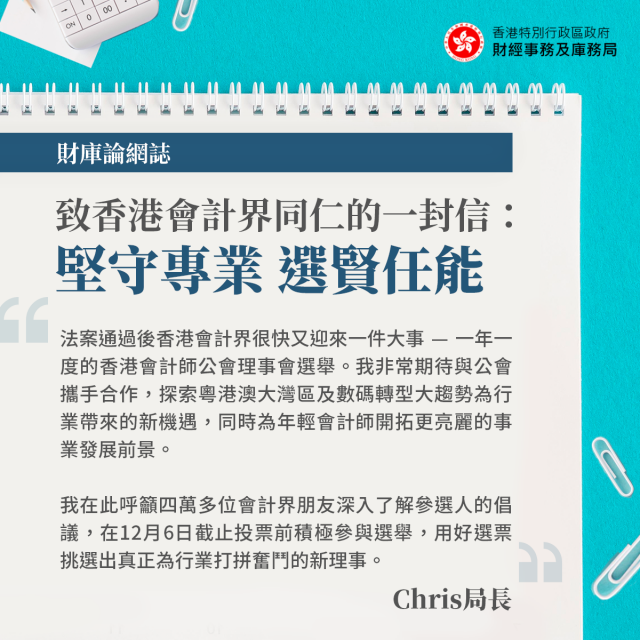 财经事务及库务局局长许正宇今日(26日)发表网志,指上月通过的《2021年财务汇报局(修订)条例草案》,标志着会计专业发展的一个里程碑。 许正宇指出,政府一直以来与香港会计师公会有着良好的协作关系,亦期待继续维系及深化双方的沟通,为业界的长远发展并肩前行。让行业向前迈进的种种机会,都需要一个有远见、抱负及承担的专业公会理事会全力推动。假若不幸有人模糊了专业及政治的界线,令公会专业平台失焦,偏离其专业宗旨而再不能为推动业界前进发挥作用,届时,政府将别无选择,检讨公会的定位及职能,重新审视与公会的关系。 许正宇呼吁4万多位会计界人士,深入了解参选人的倡议,在12月6日截止投票前积极参与香港会计师公会理事会选举,用好选票挑选出真正为行业打拼奋斗的新理事。