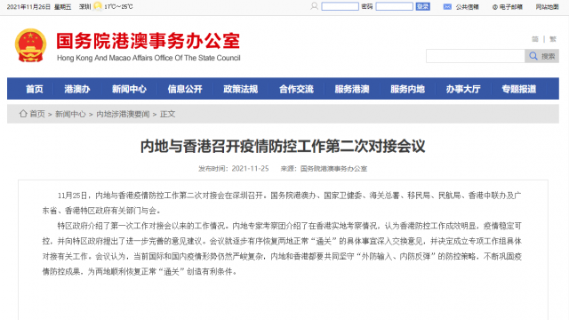 内地与香港疫情防控工作第二次对接会昨日在深圳召开。国务院港澳办网站随后发布消息指,内地和香港都要共同坚守“外防输入、内防反弹”的防控策略,不断巩固疫情防控成果,为两地顺利恢复正常“通关”创造有利条件。 据港澳办网站消息,昨日港澳办、国家卫健委、海关总署、移民局、民航局、香港中联办及广东省、香港特区政府有关部门与会。 在会议上,特区政府介绍了第一次工作对接会以来的工作情况。内地专家考察团介绍了在香港实地考察情况,认为香港防控工作成效明显,疫情稳定可控,并向特区政府提出了进一步完善的意见建议。会议就逐步有序恢复两地正常“通关”的具体事宜深入交换意见,并决定成立专项工作组具体对接有关工作。 会议认为,当前国际和国内疫情形势仍然严峻复杂,内地和香港都要共同坚守“外防输入、内防反弹”的防控策略,不断巩固疫情防控成果,为两地顺利恢复正常“通关”创造有利条件。
