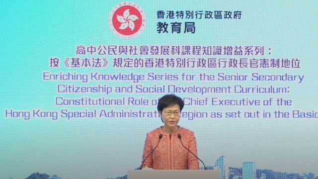 行政长官林郑月娥今日下午向高中公民与社会发展科教师授课,主题是“按基本法规定的香港特别行政区行政长官宪制地位”。教育局局长杨润雄、副秘书长康陈翠华等人都有出席课堂;课堂同时经网上及电视直播。 林郑月娥表示,香港自古以来是中国一部分,因为三条不平等条约而成为殖民地;而中华人民共和国在上世纪恢复联合国合法席位后,就提出将香港及澳门由殖民地的名单剔除,获联合国大比数通过。 林郑月娥又指,事件反映国家在50年前对主权问题已是非常坚定,因此不难理解为何当有人鼓吹国家分裂、民族自决、香港独立时,会引来全国人民反弹。 回归以来已三次推动政改 林郑月娥批评,近年很多所谓追求民主的人士指,行政长官不是由一人一票产生,是中央政府亏欠港人,她认为有关概念是错误,因为根据基本法第45条,行政长官是在本港通过选举或协商产生,而且特区政府在回归以来,经已三次推动政改;她又指2014年讨论政改时,有人提出以“公民提名”产生行政长官候选人,是违反基本法第45条规定。 林郑月娥说,以行政长官为首的行政主导体制,不是新创,香港回归前的首长一直都是港督,但亦从来没有选举或谘询过港人。她又表示,不想特别批评过去的通识教育科,强调新设的公民科是要让学生更掌握三个核心元素,包括国家近代发展、“一国两制”下的香港,以及国际形势,否则学生未来的竞争力会受损。 林郑月娥又说,受到社交媒体等因素影响,新一代慢慢不重视一些中国人的家教及美德,令她感到忧虑,认为“做人要有一些底线”,因此期望教师可以多加着重培育学生。 林郑月娥早前在立法会宣读任内最后一份施政报告时曾表示,为了让公民科教师掌握行政长官在“一国两制”下的宪制地位和职权,她会亲自为有兴趣的老师上一堂课。