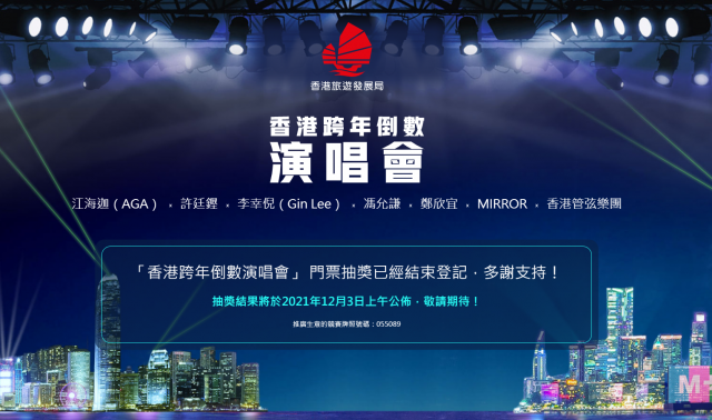 旅发局主办的“香港跨年倒数演唱会”门票抽奖活动登记期结束,超过20万人参与,电脑系统将随机抽出1500名登记人,即共3000名参加者,结果将于下星期五在网上公布,得奖者会于最迟下月5日接获短讯通知。 旅发局表示,演唱会门票採用实名制,得奖者及同行者须于下月3至13日期间,带同得奖短讯、身份证及新冠疫苗接种纪录,前往指定地点领取门票,不接受任何授权代领。 演唱会将于12月31日晚上10时至明年1月1日凌晨12时半,在西九文化区艺术公园举行,同时会透过电视及网上直播。演出歌手包括冯允谦、郑欣宜、江海迦(AGA)、许廷铿、李幸倪(Gin Lee)、MIRROR以及香港管弦乐团。