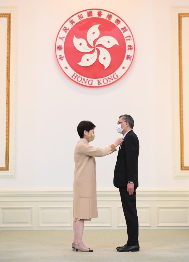 张举能获颁大紫荆勋章。(政府新闻处) 2021年度勋衔颁授典礼今日(20日)起一连三日在礼宾府举行,行政长官林郑月娥主持授勋仪式,有700多人获授勋及嘉奖,受新冠疫情影响及遵守社交距离措施,今年的典礼以闭门形式进行。 郑若骅获颁大紫荆勋章。(政府新闻处) 7人获颁大紫荆勋章,包括终审法院首席法官张举能、律政司司长郑若骅、市建局主席周松岗、行政会议成员叶刘淑仪、全国侨联副主席卢文端、观塘区议会前主席陈振彬,以及全国政协常委蔡冠深。 黄国健获颁金紫荆星章。(政府新闻处) 获颁金紫荆星章的有18人,包括工联会荣誉会长黄国健、经民联主席卢伟国、西九文化区管理局行政总裁冯程淑仪、基本法委员会委员陈弘毅、前刑事检控专员江乐士(Grenville CROSS)、以及恒基地产主席李家诚等。 海关前关长邓以海获颁银紫荆星章。(政府新闻处) 多名纪律部队成员亦获授勋,海关前关长邓以海获颁银紫荆星章,警务处处长萧泽颐等获颁香港警察卓越奖章;而在前年社会事件中执勤遇袭受伤的警长孙伟薇及雷俊杰获授银英勇勋章。 警务处处长萧泽颐等获颁香港警察卓越奖章。(政府新闻处) 林郑月娥也向早前追截走私快艇时堕海殉职的总督察林婉仪,追授金英勇勋章,表扬她英勇及无私精神。