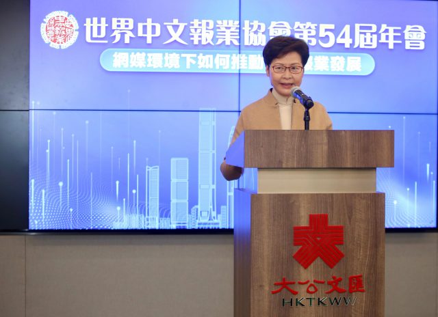 世界中文报业协会第54届年会于今日(18日)举行,受疫情影响主会场设在香港,通过视频连线的方式举行年会。香港特区行政长官林郑月娥、香港中联办副主任卢新宁及世界中文报业协会首席会长姜在忠等出席年会。林郑月娥在致辞时表示,报章及其他传媒在维护国家安全上都有重要角色,她重申香港国安法明确提出保障新闻自由。 林郑月娥说,本港的海内外媒体每天都在行使新闻自由,包括监察及批评政府施政,希望媒体同时自觉维护国家安全,并主动向社会传递有关国家安全的讯息。她强调,如果国家安全不获充分保障,新闻自由及各项权利自由亦失去基础,又指中文报章属政府发放讯息的重要途径,希望出席活动的传媒支持及指导政府工作。 林郑月娥指出,随着科技的发展,互联网及智能手机的普及,提高了资讯传播的速度,改变了大众的生活和工作模式,然而不论传播的速度或方式如何革新,资讯本身的内容才是最重要的,而这个也是新闻媒体的核心价值。她认为,高质素的新闻媒体不但能为读者或观众搜集及发掘资讯,还具备分析、解读、评论等功能,能让公众关心和了解社会的情况和重要的议题,促进良性讨论,推进社会变革和进步。基于新闻媒体这些重要的功能,林郑月娥认为,即使科技日新月异,新闻媒体的价值和存在的必要性始终如一。 林郑月娥又说,虽然新闻媒体的价值毋庸置疑,但科技十多年的发展和应用确实对新闻媒体,特别是报业的经营环境带来重大的变化和挑战。她指,现今很多人,尤其是年轻一代都少买报纸及看报,而是通过手机、网络及社交媒体取得资讯和看新闻。她说,根据调查,近年使用电子版看新闻的人数有明显增长,在2010年,印刷版的新闻报纸占据市场71.5%,网页版仅28.5%,当时手机版仍未出现,到2019年,相应的市场占有率已经变为印刷版40%,网页版25.3%,手机版34.7%。在不足十年时间,印刷版及电子版占据的份额出现了逆转,相信电子版所占的比重还有可能进一步增加。 林郑月娥认为,中文报业有需要因应时代的变化做出转型,而事实上大部分报章已做跨媒体的发展,除了出版实体的报纸,都会开拓网上版及应用程式版,也会在社交媒体发布消息,以吸引更多读者;业界今后仍要不断留意科技发展及读者习惯变化,不断探索如何在网络世界中扩大中文报业的影响力。 林郑月娥续说,虽然报纸发展受到前所未有的冲击,但报纸仍在读者市场占有重要份额,纸媒和网媒是可以并存,而且应该是互相补足,传播速度快的网媒比较适合发放短小、及时性的资讯,而传统的报纸可以作出更深入的分析、评论,引导读者思考和讨论重要的议题,帮助社会寻求及凝聚共识。 此外,林郑月娥说,网络的普及固然加快了资讯的流通,但也引起问题,如错误资讯和虚假消息的快速传播。她举例,前年下半年本港出现黑暴乱象,有人别有用心散播虚假消息,煽动大量青年违法,报业应更进一步考虑公众利益,除了拒绝报道假新闻,更应主动纠正社会流传的错误资讯,例如运用影响力,鼓励市民接种新冠疫苗。 林郑月娥最后说,明年是香港回归25周年,形容明年是到访香港的最佳机会,欢迎不同媒体届时派员到香港采访,亲眼见证香港的转变,报道香港的最新面貌,她承诺政府相关部门会提供所需协助。
