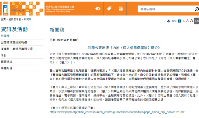 个人资料私隐专员公署(私隐公署)今日(18日)宣布,已出版《内地〈个人信息保护法〉简介》,让公众及企业加深对内地个人信息保护的认识。 私隐专员钟丽玲表示,《个人信息保护法》是内地首部针对个人信息保护而订立的法律。在《粤港澳大湾区发展规划纲要》的国家发展战略下,香港与内地的民、商交往及数据流动将更加频繁,相信《简介》能加深公众及企业对内地个人信息保护主要规定的认识,从而帮助他们把握国家发展的机遇,发挥所长。 《简介》共分三部分,首两部分分别介绍《个人信息保护法》的制定背景及主要规定,并加插了相关法规的规定以及案例,至于第三部分绍其他与保护个人信息相关的法规。《简介》亦附上香港《个人资料(私隐)条例》与内地《个人信息保护法》的比较,了解两套法例的相近及相异之处。 内地《个人信息保护法》于8月20日经全国人大常委会通过,并已于本月1日起实施。新法明确个人资料处理和跨境提供的规则、个人资料处理者的义务等内容。