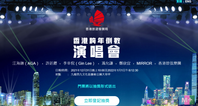 旅游发展局举办的「香港跨年倒数演唱会」 门票抽奖活动,一连10天的登记期今日(15日)展开。登记网站今早10时正式开通时,一度显示要轮候20分钟,最后只需等候数分钟就可登入,登记人需要在5分钟内完成登记,登记资料包括登记者与同行者的英文全名及身份证号码,登记者的手提电话号码。 登记者须已年满18岁,同行者年满12岁,两人均须在下月13日或之前在香港完成接种新冠疫苗。旅发局强调,门票并非先到先得,登记的先后次序亦不会影响中奖机会。登记期本月24日下午5时30分结束,结果下月3日公布。座位于抽奖时由电脑系统随机编配。 香港跨年倒数演唱会将于12月31日晚上10时至元旦凌晨12时半,旅发局将透过电视及网上全球直播。