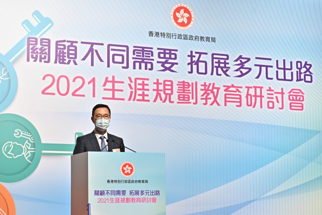 教育局今日(12日)举行「2021生涯规划教育研讨会」,约900名教育工作者及合作伙伴借此交流经验,提升他们在生涯规划教育方面的专业能力。教育局局长杨润雄发言时表示,今年国家颁布的《十四五规划纲要》,在多个重要范畴上支持香港的未来发展,便利港澳青年到大湾区内地城市就学、就业和创业,并鼓励青年人放眼四周,抓紧香港融入国家发展大局的独特机遇。 杨润雄又说,面对科技日新月异,新兴行业如雨后春笋,多元化的人才,正是当前社会所需,强调教育局一直重视照顾学生的多样性,提倡多阶进出的升学途径,培育他们发展所长。
