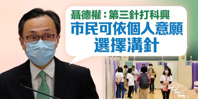 政府今日起为指定群组,包括免疫力弱及有较高风险人士等接种第三针新冠疫苗。行政长官林郑月娥今早到北角渣华道体育馆的疫苗接种中心,接种第三针科兴疫苗。公务员事务局局长聂德权和食物及衞生局局长陈肇始亦有到场。 聂德权表示,21间疫苗接种中心有足够能力应付市民打针的需求,会视乎指定群组的接种情况,尽快开放让已接种两剂科兴疫苗,而第二剂已接种超过六个月的人,接种第三针。 聂德权又指,自己头两针都是打科兴,因此较喜欢灭活疫苗的平台,第三针也选择了科兴。 对于林郑月娥日前表示,自己会继续接种科兴,又指抗体水平“不是越高越巴闭”,聂德权说,相关资讯已经很清楚,目前两款疫苗都是安全有效,抗体水平虽然有分别,但预防重症和死亡的保护力相若,市民可以按自身情况和意愿,选择哪一款疫苗。 政府正分阶段展开接种第三针疫苗计划,特定群组由今日起可免费打第三针,包括免疫力弱人士,例如癌症病人、器官移植病人、晚期爱滋病患者、需服药压制免疫系统的人士等,他们打第二针后最少四星期打第三针;较高感染风险人士,例如60岁或以上长者、医护人员、长期病患者、工作环境有较高暴露/传播风险的员工,他们打第二针后最少六个月打第三针。