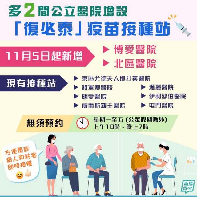 政府公布,今日(5日)起再多两间公立医院增设新冠疫苗接种站,即博爱医院和北区医院,方便到医院覆诊的病人和访客即时接种复必泰疫苗,无须预约。 政府指,公立医院新冠疫苗接种站现增至9间,开放时间为星期一至五(公众假期除外)上午10时至晚上7时。 政府又说,冬季将至,新冠病毒和流感病毒或随时㚒击,呼吁仍未接种疫苗的人士快打疫苗,而已打两针免疫力弱的病人、长者或长期病患等特定组别人士,亦可利用这些方便的接种站,接种第三剂疫苗。