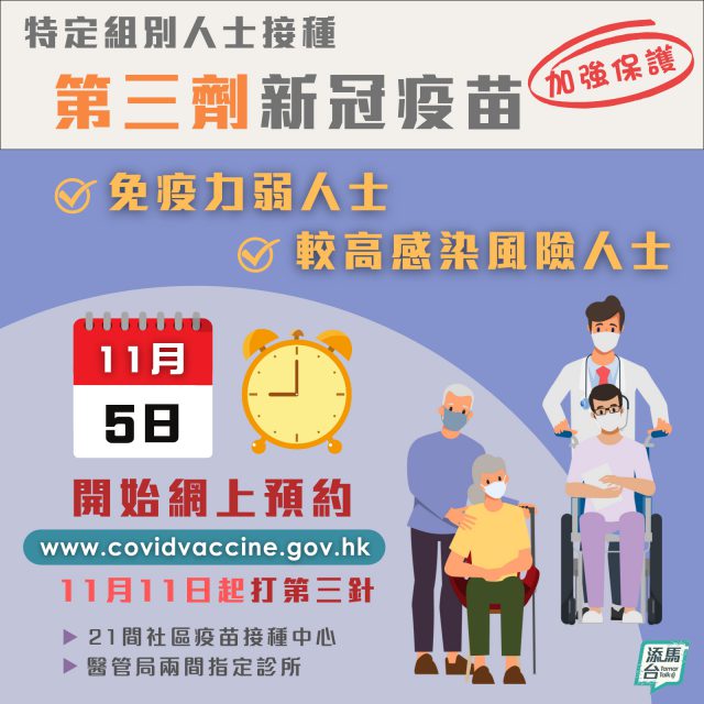 政府早前宣布为合资格的特定组别人士免费接种第三剂新冠疫苗,相关人士今日(5日)上午9时起可上网预约,于下周四(11日)或之后到21间社区疫苗接种中心或医管局两间指定诊所打第三剂新冠疫苗。 政府指,全球疫情仍然严峻,变种病毒株入侵的风险甚高,免疫力弱和高危人士快按时打第三针,为自己加强防卫。 两类人士可优先接种第三剂疫苗: 免疫力弱人士(如癌症病人、器官移植病人、晚期爱滋病患者、需服药压制免疫系统的人士等) 打第二针后最少4星期打第三针 较高感染风险人士(60岁或以上长者、医护人员、长期病患者、工作环境有较高暴露/传播风险的员工) 打第二针后最少6个月打第三针