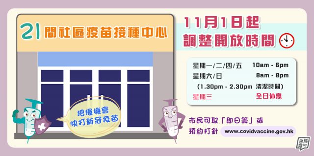 新冠疫苗接种持续放缓,疫苗接种中心本月起缩减服务时间,并逢周三全日休息,即今日(3日)不设打针服务。 香港政府早前表示,由11月1日起,社区疫苗接种中心由26间减至21间,服务时间亦有调整,周一至五服务时间为上午10时至下午6时,逢周三全日休息,周六及日则上午8时至晚上8时提供服务。 香港政府指,市民可取“即日筹”即场接种新冠疫苗(设于私家医院的接种中心除外),或于网上预约接种科兴或复必泰疫苗,又呼吁尚未接种疫苗的市民应把握时间尽快接种,保护自己和家人。 其他接种途径: 科兴疫苗 - 医管局马鞍山家庭医学中心和天水围(天业路)社区健康中心(须预约) - 参与计划的私家医生和诊所 复必泰疫苗 - 设于7间公立医院的新冠疫苗接种站(无须预约)