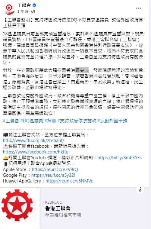 工联会支持港府DQ不符要求区议员促外国政府停止抹黑干预