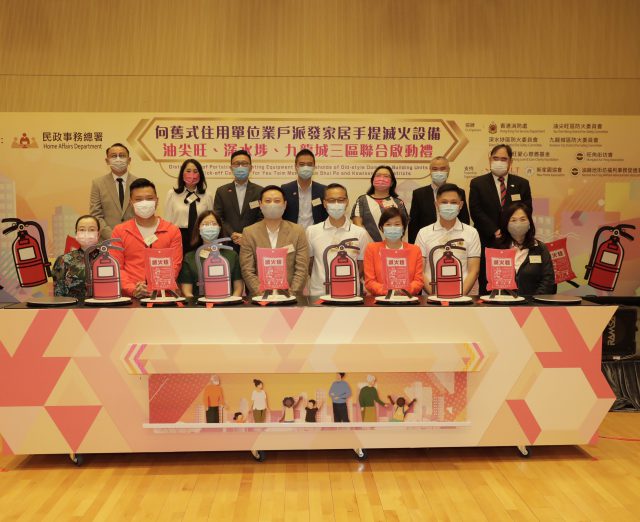 民政事务总署今日举办向旧式住用单位业户派发家居手提灭火设备油尖旺、深水埗、九龙城三区联合启动礼。(政府新闻处) 因应早前在旧式楼宇发生火警,地区有意见认为应向有需要的住户提供灭火筒或灭火毡,有助提升家居应急能力。民政事务总署今日(13日)联同油尖旺区、深水埗区、九龙城区防火会及消防处在油尖旺多元文化活动中心举行联合启动礼,向该三区的旧式住用单位派发家居手提灭火设备,包括灭火筒和灭火毡。 民政事务局局长徐英伟、民政事务总署署长谢小华及消防处处长梁伟雄今日主持启动礼。其他主礼嘉宾包括立法会议员梁美芬和郑泳舜、油尖旺区防火会主席欧楚筠、深水埗区防火会主席王琮然及九龙城区防火会主席伍海山等。 民政事务局局长徐英伟在启动礼上致辞。(政府新闻处) 徐英伟在启动礼上致辞时指出,为了提升家居消防安全,政府选定了有较多「三无大厦」的油尖旺、深水埗、九龙城三区作为试点,向居住在没有法团或管理公司的旧楼业户派发灭火筒及灭火毡,亦邀请了地区防火会协助安排派发。 欧楚筠在致辞时表示,是次计划让三区约280栋旧楼业户受惠。油尖旺区防火会将于短期内,透过地区团体的通力合作,包括旺角街坊会、油麻地街坊会、尖沙咀街坊福利会等,向目标的旧式单位上门派发灭火筒、灭火毡和宣传单张。深水埗区和九龙城区防火会也会在短期内向目标的旧式单位派发这些家居手提灭火设备。 徐英伟(右一)由余健强(左二)陪同,探访油尖旺区旧式住用单位业户,并向其派发家居手提灭火设备。(政府新闻处) 徐英伟、谢小华及梁伟雄在典礼上向三区居住在「三无大厦」的家庭派发家居手提灭火设备。启动礼后,徐英伟还探访油尖旺区的「三无大厦」人士,亲自向单位业户派发灭火筒及灭火毡,希望提高他们的防火意识。