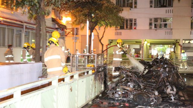 今(3日)凌晨4时许,警方接获多个报案,指荔景村仰景楼对开一电单车停泊处,有多泊电单车起火。现场火势猛烈,曾传出多次爆炸声,附近居民惊醒报警。 消防接报到场,出动一喉一烟冒队灌救,迅速将火救熄。初步点算后,至少十部电单车被烧毁。消防调查后,认为起火原因有可疑,交由警方跟进。事件中无人受伤,无需疏散。 警方指,接获多宗报案,指葵涌荔景村仰景楼对出有电单车起火。警员接报到场,消防将火救熄,初步点算有十四辆电单车被焚毁。经初步调查,消防相信起火原因有可疑。案件列作纵火,交由葵青警区刑事调查队第5队跟进,暂未有人被捕。