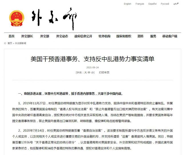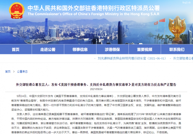 9月24日,中国外交部对外发布《美国干预香港事务、支持反中乱港势力事实清单》,外交部驻港公署发言人表示,中方发布清单是对美方日前发布「香港商业警告」、制裁中央驻港机构官员等霸凌行径的有力回击,是对美长期以来违背国际关系基本准则、干涉香港事务和中国内政、破坏香港繁荣稳定的有力揭批,是对一切外部干预势力和反中乱港分子的有力警告,彰显了中方捍卫国家主权、安全、发展利益,维护香港繁荣稳定的坚定决心、坚强意志和强大能力。 发言人表示,这份清单是记录美国粗暴干预香港事务、破坏香港繁荣稳定的「罪证薄」。清单系统梳理了2019年「修例风波」以来美方插手香港事务、干预中国内政的种种劣迹。美方炮制涉港法案,抹黑中方对港政策;悍然实施制裁,妄图阻挠香港国安法和中国全国人大有关决定在港顺利实施;污蔑诋毁特区事务,妄议香港警方执法行动,破坏香港繁荣稳定;包庇支持反中乱港分子,为其兜售「港独」主张、散播政治谎言提供平台,是非不分、颠倒黑白为违法分子说项;多边串联施压、纠集盟友联手干涉香港事务,沆瀣一气对香港事务说三道四、指手画脚。这份清单让美国干预香港事务的卑劣手段和险恶用心进一步大白于天下。事实一再表明,美国就是破坏香港繁荣稳定的最大幕后黑手,铁证如山,不容抵赖。 发言人表示,这份清单是对企图干预中国内政、遏制中国发展的外部势力敲响的「警世钟」。清单的发布向世界昭告,中国的主权、安全、发展利益不容挑战,中国全面准确贯彻落实「一国两制」方针的决心不容置疑,香港的团结、和谐、稳定不容破坏。中国人民不怕鬼、不惧压、不信邪,任何破坏「一国两制」和香港繁荣稳定的企图都逃不过中国人民的雪亮眼睛,任何人都不要低估中国人民维护民族尊严和正当权益的钢铁意志,任何打「香港牌」遏制中国发展的图谋都不可能得逞。 发言人指出,随着香港国安法的实施和香港选举制度的完善,香港开启了由乱及治、由治及兴的历史新进程,迎来了良政善治、长治久安的发展新格局。天下大势,浩浩汤汤,顺之者昌,逆之者亡。美方应从阻挡香港拨乱反正的幻想中清醒过来,从零和博弈的迷思中幡然醒悟。中方敦促美方切实尊重中国内政,恪守国际法和国际关系基本准则,立即收回干预香港事务的「黑手」,否则必将搬起石头重重地砸在自己的脚上,必将遭到中国人民的有力反击。