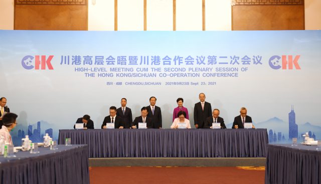 林郑月娥(前排右七)和四川省委书记彭清华(前排左七)与其他与会者合照。(政府新闻处) 行政长官林郑月娥昨日(23日)展开访问四川省成都市行程,早上与四川省领导举行川港高层会晤暨「川港合作会议」第二次会议。 国务院港澳办副主任黄柳权、四川省委书记彭清华、林郑月娥和四川省省长黄强在会后见证四川省副省长李云泽和政务司司长李家超签署《川港高层会晤暨川港合作会议第二次会议备忘录》。之后,他们又共同见证签署《关于进一步促进川港经贸合作备忘录》、《中医药战略合作框架协议》和《四川省教育厅和香港特别行政区职业训练局全面深化川港职业教育合作协议》。 四川省副省长李云泽(前排左)和政务司司长李家超(前排右)签署《川港高层会晤暨川港合作会议第二次会议备忘录》。(政府新闻处) 众人见证签署《关于进一步促进川港经贸合作备忘录》、《中医药战略合作框架协议》和《四川省教育厅和香港特别行政区职业训练局全面深化川港职业教育合作协议》。(政府新闻处) 林郑月娥下午与多位在成都准备出席2021年泛珠三角区域合作行政首长联席会议的省区领导进行双边会面。林郑月娥先与海南省省长冯飞会面,对继今年4月在博鳌亚洲论坛年会后,再次与对方见面表示高兴。她指海南在中央支持下正发展成自由贸易港,香港乐意与海南分享自身在对外开放方面的经验,同时亦希望把握海南建设自由贸易港带来的机遇。她感谢海南省愿意为香港青年提供到当地实习的机会,期望明年与海南省制订具体计划。 林郑月娥其后与广西壮族自治区主席蓝天立会面时,感谢广西支持香港抗疫工作,去年派出核酸检测支援队来港,协助特区政府推出大规模的普及社区检测计划,疫情期间亦对在桂港人提供照顾和支援。她说广西是国家与东盟之间的通道,也是「一带一路」的重要门户;随着香港积极拓展与东盟的关系及参与「一带一路」建设,她相信香港与广西未来会有更多合作空间。 林郑月娥亦与江西省省长易炼红会面。她指香港是江西最大的境外投资来源地,也一直是江西企业「走出去」的理想平台。她很高兴江西自2002年起连续多年在香港举办经贸合作交流活动,虽然去年活动因疫情影响而暂停,但随着香港疫情持续受控,期待江西未来积极考虑复办活动。 林郑月娥日间接受四川媒体访问,晚上与泛珠区域各方负责人会见四川省委书记彭清华和省长黄强,并出席泛珠晚宴和观看文艺表演。 林郑月娥将于24日出席2021年泛珠三角区域合作行政首长联席会议。 林郑月娥(左八)今晚在成都与泛珠区域各方负责人会见四川省委书记彭清华(右八)和四川省省长黄强(右七)。(政府新闻处)