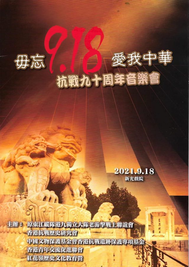 今年适逢「9.18」九十周年,值此之际,原东江纵队港九独立大队老游击战士联谊会、香港抗战历史研究会、中国文物保护基金会香港抗战遗迹保护基金、香港青年交流促进会、红花岭历史文化教育营等十多个团体,联同300多位音乐家、歌唱家、表演团队,昨日(18日)共同举办「毋忘9.18,爱我中华」纪念抗战九十周年音乐会,借抗战经典音乐,弘扬民族正气。 音乐会筹委会主席吴军捷致词时表示,前事不忘,后事之师。重温这些激励人心的抗战歌曲,将激发香港人的民族意识,家国情怀。我们不但要在这里唱响抗战歌曲,让中小学生学唱抗战歌曲、认识历史,还要保护、活化好香港的抗战遗址,创办香港抗战历史文化教育营,用生动、贴身的乡土教材,培育新一代对家乡的热爱、对生命的珍惜、对英雄的崇敬,从根本上培育出爱国主义的情感和精神。 音乐会今日在新光戏院举行,因晩场爆满,加开下午场,有1600名观众出席。参演的有久负盛名的民间音乐家,有80多岁的老游击队员,也有9岁的小歌手。既有「保卫黄河」,「太行山上」这些耳熟能详的老歌,又有「东江纵队之歌」,「再会吧,香港」这些本地名曲;还有「救亡进行曲」作词者后人的演唱,「钓鱼台战歌」等勾起人无限联想的歌曲。这是香港民间自发纪念「9.18」九十周年最大型的活动,是吹响善用本地历史题材推动爱国主义教育的一声响亮号角。 香港特区政府民政事务局徐英伟局长,中国人民解放军驻港部队杨晓海副参谋长和中联办官员,立法会马逢国、葛珮帆议员,龙子明、蔡素玉、林广兆、刘佩琼、凌友诗、黄伟雄、林珍等知名人士和多名抗战老兵出席音乐会。演出全程洋溢着强烈的爱国主义情怀,群情激昂,最后在全场齐唱「团结就是力量」的歌声中结束。