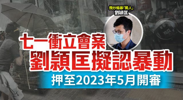 揽炒煽暴「独人」刘頴匡、港大学生会前会长孙晓岚及艺人王宗尧等14人,涉2019年7月1日借修例风波在立法会外示威及冲击立法会,被控暴动罪及进入或逗留在会议厅范围未有遵守秩序罪。刘頴匡昨日(16日)于区域法院表示拟承认暴动罪,控方已同意不继续起诉其另外一罪,将存档法庭。该案押后至2023年5月29日开审,预期审期为44天。刘的答辩将于同日进行,期间他须还柙。 27岁前「民间集会团队」发言人刘頴匡、28岁范俊文、24岁邹家成及25岁无业男林锦均同被控于前年7月1日在立法会综合大楼参与暴动。林另被控一项刑事损坏罪,指他在同日同地损坏立法会综合大楼。刘頴匡及范俊文则另被控一项进入或逗留在会议厅范围罪。除刘頴匡拟认罪外,其余3人则拟否认他们各自的控罪,3人可继续获准保释。 同案其他被控暴动及进入或逗留在会议厅范围罪的10名被告分别为城大编委记者黄家豪、学生罗乐生、运输工人何俊谚、「占旺女村长」毕慧芬、港大学生会前会长孙晓岚、「占旺画家」潘浩超、网媒记者马启聪、艺人王宗尧、地盘工人沉镜乐及吴智勇。 刘頴匡和邹家成另涉嫌揽炒派「35+初选」案,刘頴匡须还柙,邹家成早前则获准有条件保释。