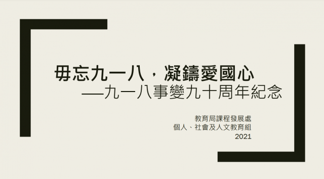 香港教育局「局中人语」昨日(8日)发表题为《九一八事变90周年——以史为鉴,共建繁荣富强的祖国》的网志,指今年是「九一八」事变90周年,为纪念这场对中国近代发展影响深远的历史事件,将会在本月举办「九一八事变与抗日战争」专题讲座及线上研讨会。 教育局称,希望借此增润教师和学生有关「九一八」事变与抗日战争的历史知识,让他们体会抗战期间,中国军民守土卫国的爱国精神,培养对民族和国家的归属感及责任感。教育局指,已制作相关的 教育局还表示,教师和学生完成相关学习活动后,可于9月28日(星期二)上午10时开始,上网观看东北沈阳「九‧一八」历史博物馆举办的「勿忘历史珍爱和平」—— 研讨会以抗日战争为主题,内容讲述日本侵华的由来、战争对中国造成的祸害,以及中国人民团结对抗日本侵略的艰辛历程。研讨会以网上循环播放,教师可鼓励学生上网观看或安排时间与学生一起观看和交流,以促进学习。 教育局总课程发展主任(个人、社会及人文教育组)叶深铭表示,近代中国饱受外侮侵凌之苦,历经了艰苦卓绝的抗战才能获取和平,述往事,思来者,国家的和平稳定实在来之不易。以史为鉴,纪念「九一八」事变正可让我们反思中国人民捍卫国家主权和维护人民福祉的重要性。