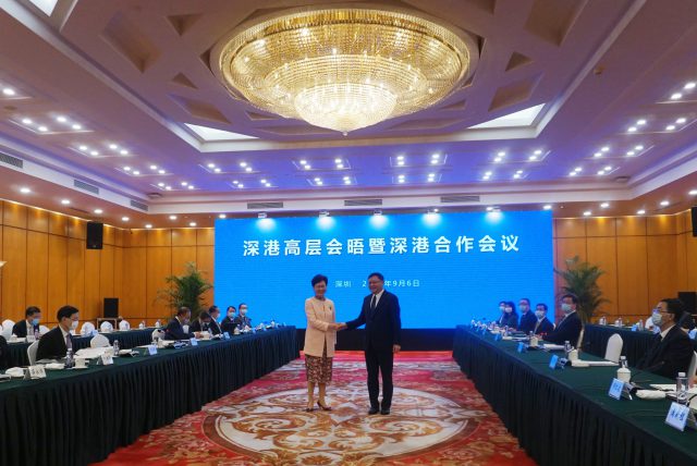 行政长官林郑月娥今日(6日)出席深港高层会晤暨2021年深港合作会议,与深圳市委书记王伟中等深圳官员会面。林郑月娥在会上表示,目前全港市民盼望早日逐步有序并免检疫到访内地。 林郑月娥感谢深圳市委及市政府在疫情期间,大力支持香港抗疫,并为香港居民做了大量工作。同时她亦提及,香港过去两年经历由乱转治的重大转折,形容《香港国安法》有如定海神针,而完善选举制度有助本港重回「一国两制」正轨,既解决香港当前面对的问题,亦为香港融入国家发展大局扫除障碍。 林郑月娥指,港深关系独一无二且历久常新,又指《粤港澳大湾区发展规划纲要》列明港深属大湾区中心城市,要成为区域发展的引擎,相信港深合作对发展经济和改善民生,都有极为关键的作用。 王伟中则表示,深港关系唇齿相依,两地联手抗疫,令深港亲如兄弟的关系更加牢固,当前深港合作的力度和成效,都处于历史最好水平。他又指,深圳将始终对接香港所需,深化深港部署和合作,努力打造深港双城经济,希望深港成为全球最璀璨夺目的「双子星」。