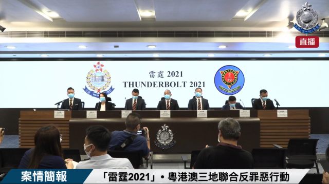 香港警方今日(6日)上午召开记者会表示,有组织罪案及三合会调查科联同各区刑事总部,今年6月至8月期间进行代号为「雷霆2021」的大规模粤港澳三地联合反罪恶行动,打击「黄赌毒」。 警方指,粤港澳三地警方采取行动,打击三合会和有组织犯罪活动。其中香港警方共拘捕2320人,年龄介乎11至84岁,捣破多个非法赌档、卖淫场所和毒品分销中心,检获毒品、攻击性武器、私烟、私油、色情光碟和非法投注记录。今年6至8月,警方联同海关、消防和入境处搜查约2000间处所。 广东警方则在行动中拘捕超过1100人。澳门警方将2100人拘捕或带返警署调查。两地警方检获大批毒品、现金、伪造旅游证件、走私货品和攻击性武器。
