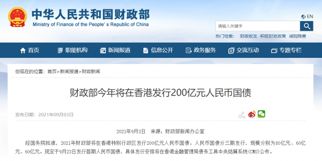 国家财政部昨日(3日)宣布,将于今年在香港分三期发行共200亿元人民币国债,规模分别为80亿元、60亿元及60亿元,具体细节再作公布。 政府发言人对此表示,香港特区政府欢迎财政部连续第十三年在香港发行人民币国债。这充分展示中央政府大力支持香港进一步巩固其作为国际金融中心及全球离岸人民币业务枢纽的地位,并有助香港进一步促进债券市场的长足发展。