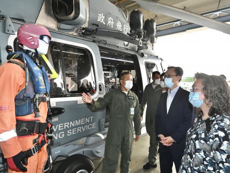 公务员事务局局长聂德权昨日(18日)到访政府飞行服务队,与管理层和不同职系同事见面,了解他们的工作和关心的事宜。 聂德权欣悉,自疫情爆发以来,飞行服务队一直保持高度的防疫意识,至今部门已有超过九成同事接种了第一剂新冠疫苗,为在社会上建立保护屏障出一分力。他同时勉励同事坚守岗位,继续为市民和政府部门提供优质高效的飞行支援服务。 聂德权与公务员事务局常任秘书长杨何蓓茵首先在飞行服务队位于湾仔的直升机坪乘坐直升机,在飞行服务队总机师(行动)施云龙机长陪同下,亲身体验机组人员在飞行期间的工作,并从高空观看模拟的海岸救援。聂德权欣悉前线机组人员定时进行模拟演练和培训,以提升紧急应变能力和效率。在赤鱲角总部,聂德权先后参观飞机库和飞行指挥及控制中心,分别了解飞行服务队现役机队和相关设备以及维修工作,并听取同事介绍如何按行动需要和紧急情况调遣飞机及分配人手。