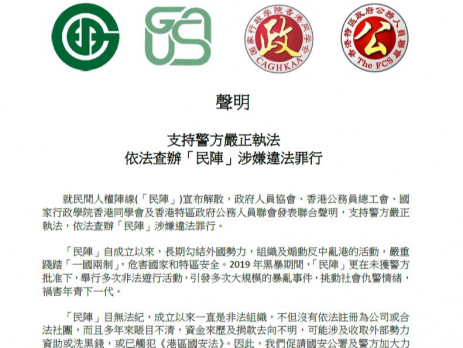 「民阵」昨日宣布解散。四个公务员工会今日(16日)发表联合声明支持警方严正执法,依法查办「民阵」涉嫌违法罪行。 声明指,「民阵」自成立以来,长期勾结外国势力,组织及煽动反中乱港的活动,严重践踏「一国两制」,危害国家和特区安全。2019年黑暴期间,「民阵」更在未获警方批准下,举行多次非法游行活动,引发多次大规模的暴乱事件, 挑动社会仇警情绪,祸害年青下一代。 声明批评「民阵」目无法纪,成立以来一直是非法组织,不但没有依法注册为公司或合法社团,而且多年来账目不清,资金来历及捐款去向不明,可能涉及收取外部势力资助或洗黑钱,或已触犯香港国安法。因此,促请国安公署及警方加大力度查办「民阵」涉嫌违法的罪行,坚决执法,绝不能姑息。 声明最后指出,随着「民阵」等反中乱港组织陆续解散,让香港社会进一步增强了由乱及治的信心。全力支持特区政府推动各项维护国家安全的工作,并深信在香港国安法保驾护航和「爱国者治港」原则下,香港社会将加快重回正轨,必能确保「一国两制」行稳致远。 四个公务员工会分别为政府人员协会、香港公务员总工会、国家行政学院香港同学会及香港特区政府公务人员联会。