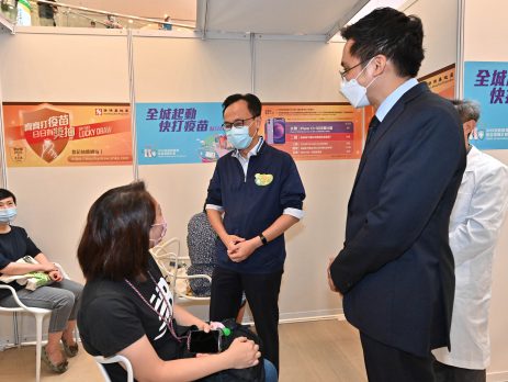 香港政府新冠疫苗外展队昨日(5日)在观塘一个大型购物商场设立临时接种疫苗柜位,除了为商场和写字楼租户接种疫苗外,更尝试让一些市民在免预约的情况下,便捷地即场接种疫苗。 公务员事务局局长#聂德权# 感谢商场提供场地,促成这次新冠疫苗接种服务,并与政府携手推动「全城起动快打疫苗」运动,透过大幅提升疫苗接种率,尽速为香港建立保护屏障。这是外展队首次在商场提供无须预约的新冠疫苗接种服务,让一些市民「想打针、即打针」,即场接种疫苗。今日共有近300名商场和写字楼租户及市民在商场接种复必泰疫苗。