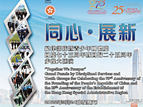 「同心.展新」中式步操大汇演将于明日(24日)下午2时30分举行 为庆祝中华人民共和国成立73周年暨香港特别行政区成立25周年,香港特区政府保安局辖下各纪律部队、辅助部队及9支青少年团队,将于明日(24日)下午2时30分在将军澳消防及救护学院举行「同心·展新」中式步操大汇演。保安局局长邓炳强,各纪律部队首长,包括警务处处长萧泽颐、海关关长何珮珊、惩教署署长黄国兴及消防处处长杨恩健等近日陆续在Facebook专页现身拍片预告盛事,市民届时可透过直播观赏演出。 保安局昨日表示,参与明日「同心·展新」纪律部队暨青少年团体庆国庆73周年暨回归25周年步操大汇演的纪律部队和辅助部队,来自香港海关、政府飞行服务队、惩教署、消防处、警务处、入境事务处、医疗辅助队和民众安全服务队。 转中式步操后首次联演 步操大汇演于下午2时30分举行,精彩表演项目包括纪律部队同场表演中式步操,是各纪律部队转用中式步操以来首次联合步操表演。各纪律部队和辅助部队会进行军乐和音乐表演,纪律部队的领犬员亦会与工作犬作执法示范表演。 各纪律部队属下的青年团队,包括海关青年领袖团、惩教署更生先锋领袖、消防及救护青年团、少年警讯、入境事务处青少年领袖团、医疗辅助队少年团和民众安全服务队少年团,将联同香港青少年军总会和香港航空青年团,表演舞龙狮和军体拳。 由于疫情关系,步操大汇演不设公众门票。保安局欢迎市民届时透过电视及相关社交平台和网站的直播,观赏历时一个半小时的精彩演出。直播平台包括香港电台港台电视31及32;保安局、纪律部队和港台的Facebook专页;政府新闻处网站及香港电台YouTube频道。