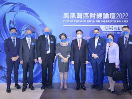 凤凰卫视、凤凰网联合多家机构於今日举办「凤凰湾区财经论坛 2022变局与信心」 新冠肺炎疫情衝击和地缘政治导致全球贸易平衡屡遭波折。面对世界百年大变局和未来发展的不确定性,处在中国内外循环交汇点的粤港澳大湾区,如何寻求新思路、探索新视角?凤凰卫视、凤凰网联合多家机构於今日(21日)举办「凤凰湾区财经论坛 2022变局与信心」,為期两天,邀请政府官员、专家学者、行业精英,為全球经济及湾区发展寻找新机遇,探讨新方向,提升粤港澳大湾区国际竞争力。 凤凰卫视、凤凰网联合多家机构於今日(21日)举办「凤凰湾区财经论坛 2022变局与信心」,行政长官李家超发表开幕演讲。