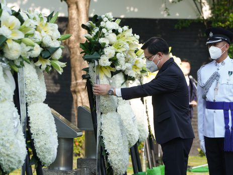 香港特别行政区政府今日(3日)在香港大会堂纪念花园举行官方仪式,纪念中国人民抗日战争胜利。行政长官李家超和政府高层官员今早出席仪式。纪念仪式包括奏唱国歌、升旗仪式、警察步枪仪仗队鸣枪致敬、全体出席者默哀及鞠躬致敬。 其他出席仪式人士包括全国政协副主席、中央人民政府驻港机构代表、终审法院首席法官、前任行政长官、行政会议成员、立法会议员、退伍军人团体代表、全国人民代表大会香港地区代表、港区全国政协委员代表、乡议局代表及各制服团队代表等。 为铭记中国人民抵抗日本侵略,缅怀先烈和死难同胞,全国人民代表大会2014年将9月3日确定为中国人民抗日战争胜利纪念日。香港特别行政区政府亦自该年起,在香港举行相应的官方纪念活动。