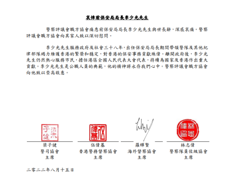 香港4个警察协会哀悼李少光离世赞对香港保安事务贡献殊伟