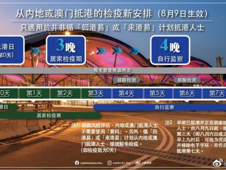 政府宣布调整防疫措施,今日(9日)起在「疫苗通行证」加入「红黄码」,确诊人士会获发「红码」,由海外地区或台湾来港人士会获发「黄码」。本周五起,由海外地区或台湾来港人士检疫安排划一为「3+4」。 行政长官李家超在社交媒体上表示,特区政府陆续调整从内地或澳门抵港人士检疫安排,今日起,内地或澳门抵港人士若循「回港易」或「来港易」计划抵港,继续不用强制检疫;其他人士居家强制检疫期由7天减至3晚,检疫期间不可外出。完成检疫后,开始4晚自行监察,期间没有外出限制。 内地非「来港易」来港不受黄码限制 李家超提到,根据风险评估,内地或澳门抵港人士不需要使用「黄码」。早前已抵港并正在进行居家检疫的相关人士,由今日起,他们在抵港第3天(即8月6日或之前抵港)早上9时后,可视为完成居家检疫并移除电子手环,并作自行监察至抵港第7天。
