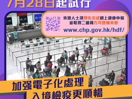 政府公布,今日(28日)起,试行改良版电子健康申报系统。来港人士要在登机前填妥网上电子健康申报,并取得二维码。二维码有效时间为96小时。 来港人士需要在办理登机手续时出示二维码,同时提供疫苗接种证明及指定检疫酒店预订编号等资料。 另外,政府计划在八月,逐步电子化登机前的文件确认程序,包括经电子健康申报表系统核对来港人士申报的疫苗接种证明,和指定检疫酒店预订等相关资料,让旅客可以凭一个二维码,进行「检测待行」及前往指定酒店等检疫程序。 当局说,现时有部分抵港人士在到埗后才填写健康申报表,有机会在繁忙时间造成阻碍。新做法将有助逐步加强电子化核对,精简入境检疫手续,大幅减省抵港人士在机场逗留的时间,减少轮候及出现樽颈的情况。 点此进行健康申报