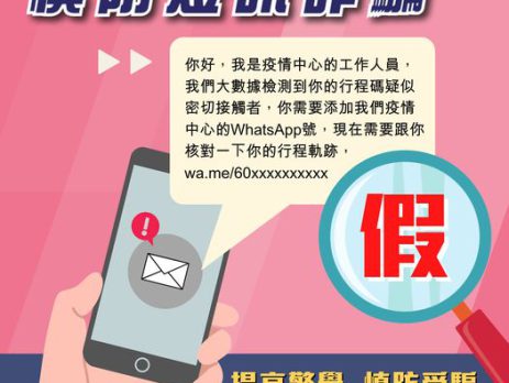 政府昨日(21日)表示,近日有市民收到讹称来自「疫情中心」的诈骗短讯,声称该市民是疑似密切接触者,要求他们以通讯程式Whatsapp联络,可能用以骗取个人资料。 政府提醒市民遇到可疑短讯必须小心求证,并提醒身边亲友提高警觉,慎防受骗。如有怀疑,可致电「防骗易」热线18222查询。 更多防疫资讯,可浏览政府专题网站了解。(点击浏览)