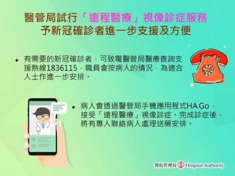 香港第五波疫情有反弹迹象,确诊数连续7日破3000宗。政府表示,有见疫情持续严峻,为了提供更多支援及便利予新冠确诊者,医管局现试行「远程医疗」视像诊症服务,让经评估为情况适合的新冠病人安坐家中,亦可获得医生遥距视像诊症及送药服务。 有需要的新冠确诊者,可先致电医管局的医疗查询支援热线1836115,医管局职员其后会按病人的情况,主动识别适合的病人并与其联络,让病人透过医管局手机应用程式HA Go,接受「远程医疗」视像诊症及送药服务。完成诊症后,将有专人联络病人处理送药安排,医管局的药剂部同事亦会为有需要的病人提供用药咨询。 医管局会密切留意「远程医疗」视像诊症服务运作情况,为病人提供适切支援及安排。 医疗查询支援热线:1836115 服务时间:星期一至日及公众假期上午9时至下午5时
