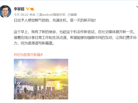 今日(7月1日)是香港回归祖国25周年庆典日。香港特区第六任行政长官李家超开通微博,他今日在首条微博中写道,“日出予人感觉朝气勃勃、充满生机,是一天的新开始!” 李家超说,“这个早上,我有了新的使命,也趁这个机会作新尝试,在社交媒体展开新一页。借着在线分享日常工作和生活点滴,希望能够加强跟市民的互动,让我们携手协力,同为香港谱写新篇章。” 中央政府早前任命李家超为中华人民共和国香港特别行政区第六任行政长官,于2022年7月1日就职。