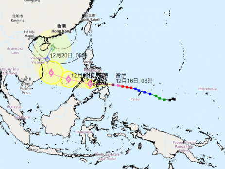 超强台风「雷伊」冬至(21日)送礼,杀入香港400公里范围,预测下周一(20日)起连落6天雨。天文台表示,香港入冬后甚少受热带气旋直接威胁,而由1961年至今只有4个热带气旋曾于12月份进入本港500公里范围,唯一一次要「挂波」更只有1974年的「艾玛」;「雷伊」随时成为历来第2次12月份挂波台风。 天文台表示,强台风「雷伊」现时已增强为超强台风。在上午10时,「雷伊」集结在马尼拉之东南约850公里,预料向西移动,时速约28公里,移向菲律宾南部。预测未来一两日横过菲律宾并进入南海南部,下周日(19日)转向偏北移动及逐渐减弱,但其后的路径及强度仍存在变数,暂时预计「雷伊」会在下周一以强烈热带风暴姿态进入香港以南800公里内,中心风力时速料会下降至105公里,并在周二冬至进一步减弱为热带风暴,靠近香港西南面约400公里,中心风力降至时速65公里。 天文台解释,香港入冬后一般甚少受热带气旋直接威胁,因南海北部水温较低,加上较凉和干燥的东北季候风亦不利热带气旋发展,会令它减弱甚至消散,而唯一一次本港12月份要「挂波」是1974年的热带气旋「艾玛」。艾玛当年12月1日逐渐靠近本港,天文台先后悬挂1号及3号风球,共维持超过27小时。12月2日天文台更录得177.3毫米雨量,创12月单日最高雨量纪录,至今仍未被打破。