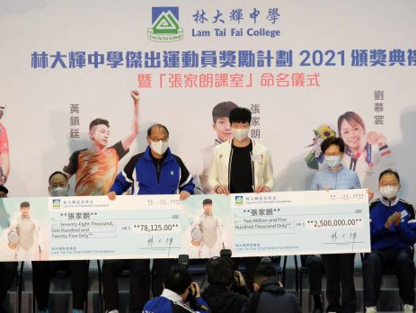 林大辉中学今日举行“杰出运动员奖励计画”颁奖典礼,并举行“张家朗课室”揭幕仪式。一众校友港队代表获颁发奖金,其中为港摘下东京奥运男子花剑金牌,有“剑神”之称的张家朗,获颁发约250万元奖金。 张家朗与另一剑击代表杨子加、单车代表李思颖、划艇代表洪泳甄等港队运动员,今早回到位于沙田的母校出席典礼。行政长官林郑月娥、民政事务局局长徐英伟及校监林大辉等人担任典礼的嘉宾。 林郑月娥致辞时表示,教育局近日推出试行版的《价值观教育课程架构》,认为当中很多价值观都在体育中体现,例如坚毅、尊重他人、国民身份认同、承担精神、勤劳等,而精英运动员站上颁奖台,国歌奏起、区旗升起之时,国民身份认同应该是油然而生。她认为,体育发展不单是争夺奖牌,更有深层的意义,希望体育界继续努力。 另外,林大辉中学将两个课室,分别以张家朗及另一旧生、东京奥运空手道女子个人形铜牌得主刘慕裳命名。 林大辉中学过去17个学年培育了不少香港体坛精英,除在东京奥运摘牌的奥运花剑金牌张家朗和空手道铜牌刘慕裳外,还有世界单车冠军郭灏霆、“乒乓一哥”黄镇廷、亚运奖牌得主欧倩莹、崔浩然、杨子加、廖文希及方凯申等人。