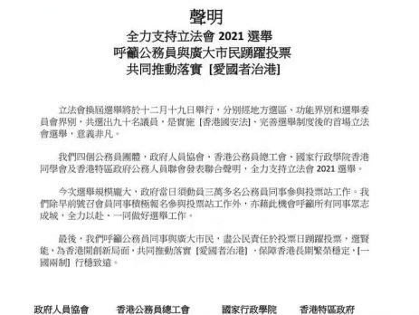 四个公务员工会发表联合声明,支持12月19日举行的立法会换届选举,呼吁参与选举工作的公务员众志成城,全力以赴,并呼吁市民尽公民责任,踊跃投票。 声明表示,今次选举是实施香港国安法,完善选举制度后的首场立法会选举,意义非凡。今次选举规模庞大,政府当日须动员三万多名公务员参与投票站工作。他们除早前号召会员同事积极报名参与投票站工作外,亦藉此机会呼吁所有同事全力以赴,一同做好选举工作。 声明最后呼吁公务员与广大市民,尽公民责任于投票日踊跃投票。选贤能,为香港开创新局面。共同推动落实“爱国者治港”,保障香港长期繁荣稳定,“一国两制”行稳致远。 参与联署的工会包括政府人员协会、香港公务员总工会、国家行政学院香港同学会,以及香港特区政府公务人员联会。
