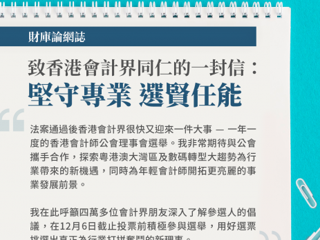 财经事务及库务局局长许正宇今日(26日)发表网志,指上月通过的《2021年财务汇报局(修订)条例草案》,标志着会计专业发展的一个里程碑。 许正宇指出,政府一直以来与香港会计师公会有着良好的协作关系,亦期待继续维系及深化双方的沟通,为业界的长远发展并肩前行。让行业向前迈进的种种机会,都需要一个有远见、抱负及承担的专业公会理事会全力推动。假若不幸有人模糊了专业及政治的界线,令公会专业平台失焦,偏离其专业宗旨而再不能为推动业界前进发挥作用,届时,政府将别无选择,检讨公会的定位及职能,重新审视与公会的关系。 许正宇呼吁4万多位会计界人士,深入了解参选人的倡议,在12月6日截止投票前积极参与香港会计师公会理事会选举,用好选票挑选出真正为行业打拼奋斗的新理事。